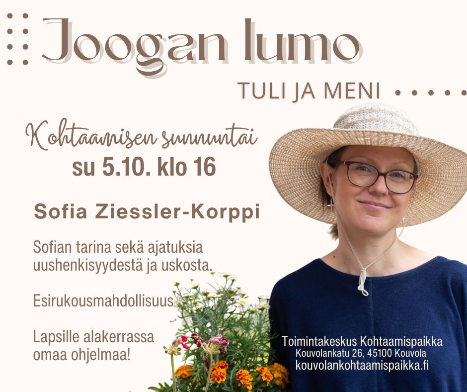 Tervetuloa Toimintakeskus Kohtaamispaikkaan sunnuntaina 5.10. klo 16 kuuntelemaan, mikä joogassa veti ja lumosi ja mitä sitten myöhemmin tapahtui. Sofia Ziessler-Korppi kertoo oman tarinansa sekä jakaa ajatuksiaan uushenkisyydestä ja uskosta.